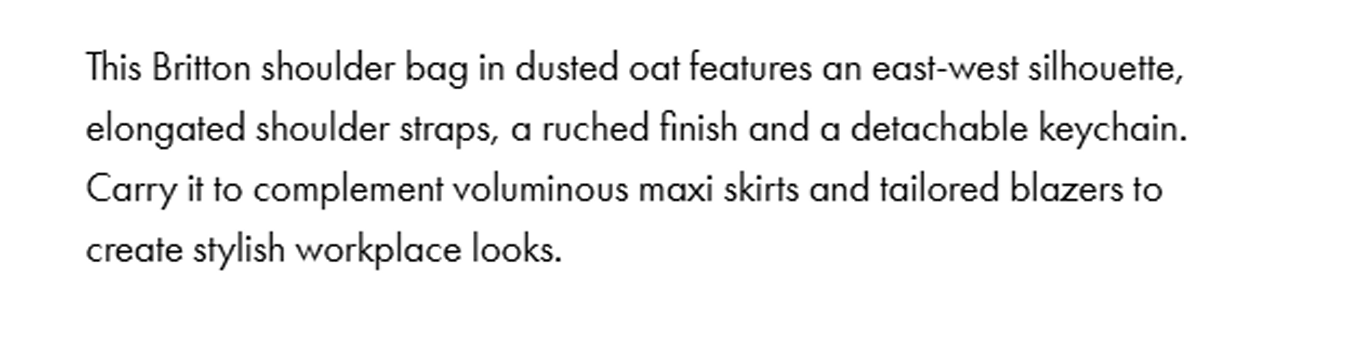 - Colours : Dusted Oat, Chocolate, Mocha Brown, Black